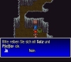 Der verrückte Koch ist eine harte Nuss. Da Ihr beim reingehen ins Restaurant alle eure Items abgelegt haben solltet (entscheidet euch nicht für einen Kampf gegen den Türsteher. Sonst bekommt ihr den Bonus-Zauber nicht), bleibt keine Heilungsmöglichkeit, außer der Zauber des Helden. Dem seine AP werden aber dringend für die Drachenmagie benötigt die bei der Vereinigung mit Sanamo freigesetzt wurde (noch nicht gemerkt das Ihr diesen Zauber habt, gell?). Setzt einen der drei Puppys ein um einen hohen Schaden zu erwirken. Dazu sollte Ryu auch volle AP-Zahl haben. Sten hat mit Level 15 den Flamme-Zauber erlernt, und dieser sollte auch eingesetzt werden. Nach dem Sieg über den Koch solltet ihr Ihm sagen das Ihr nicht böse seid und das Ihr ein warmes Herz habt. Der Koch ist davon so erfreut das er euch den Schnipp-Zauber dafür schenkt. Gebt diesem am besten Katt, da er keine AP-Punkte benötigt.